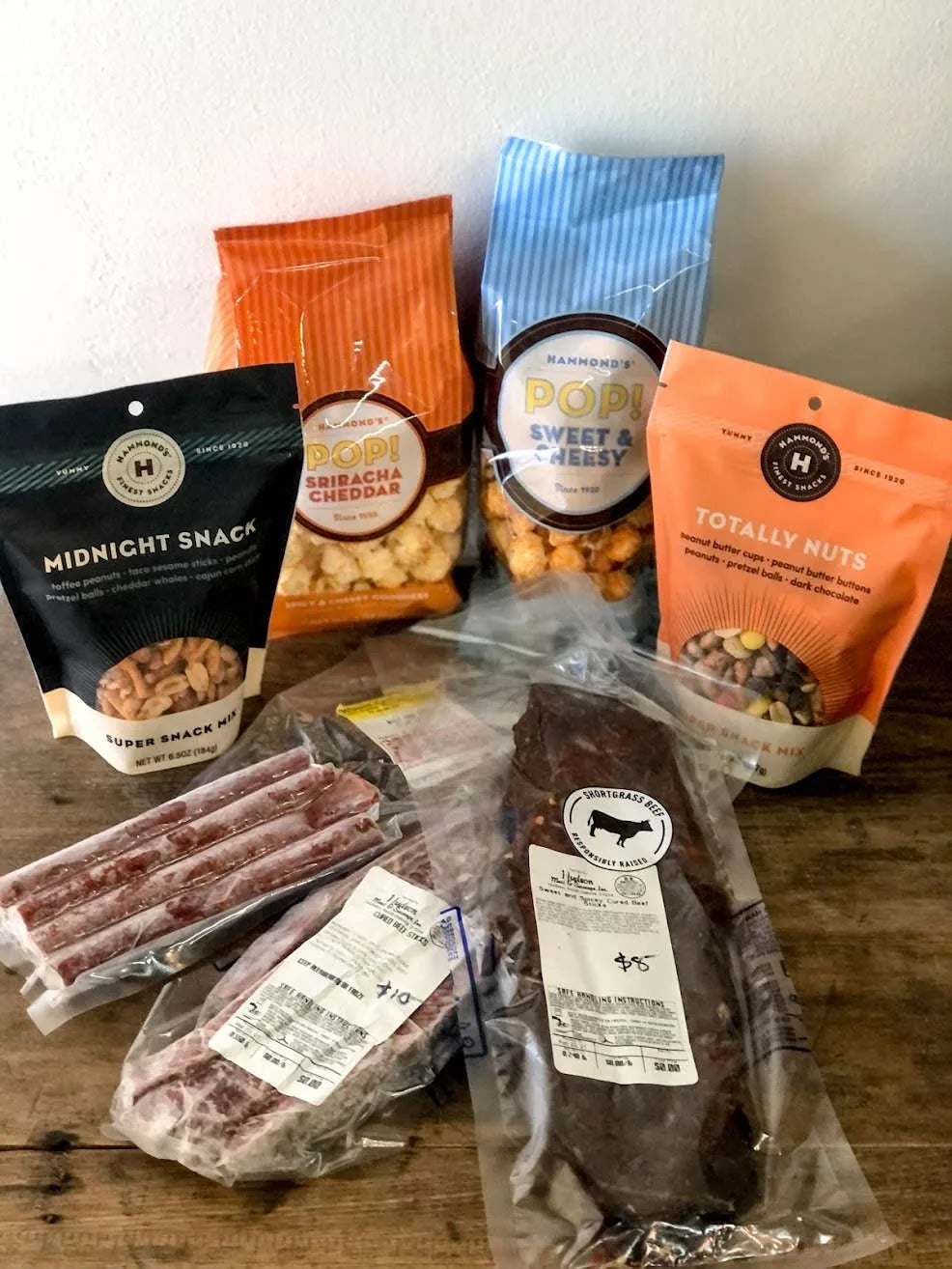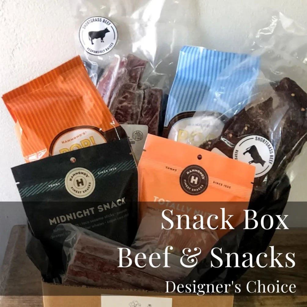 An assortment of beef snacks from Shortgrass Beef in Miller, SD with other snacks from Hammond's Candies. May include but not limited to beef jerky, beef sticks, beef strips, summer sausage, flavored popcorn, chocolate bars, snack mixes, lollipops, etc,