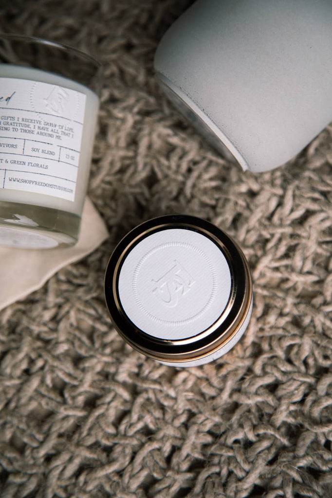 This 4 oz travel tin is made with soy blend wax and clean-burning cotton wicks and is hand-poured by women survivors