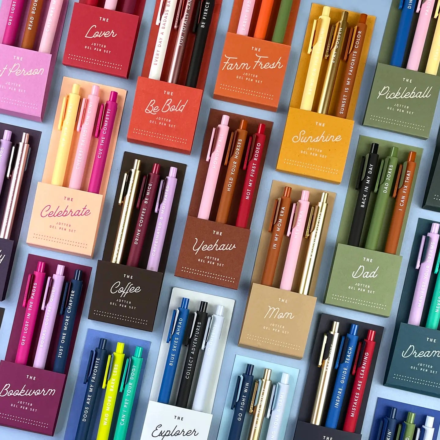 These colorful jotter gel pen sets are equal parts practical and fun, making them an easy gift for just about anyone. Each set features coordinating pens with smooth-writing gel ink, ink that also matches the barrel and playful phrases that add a little personality to everyday notes, lists, and journaling.