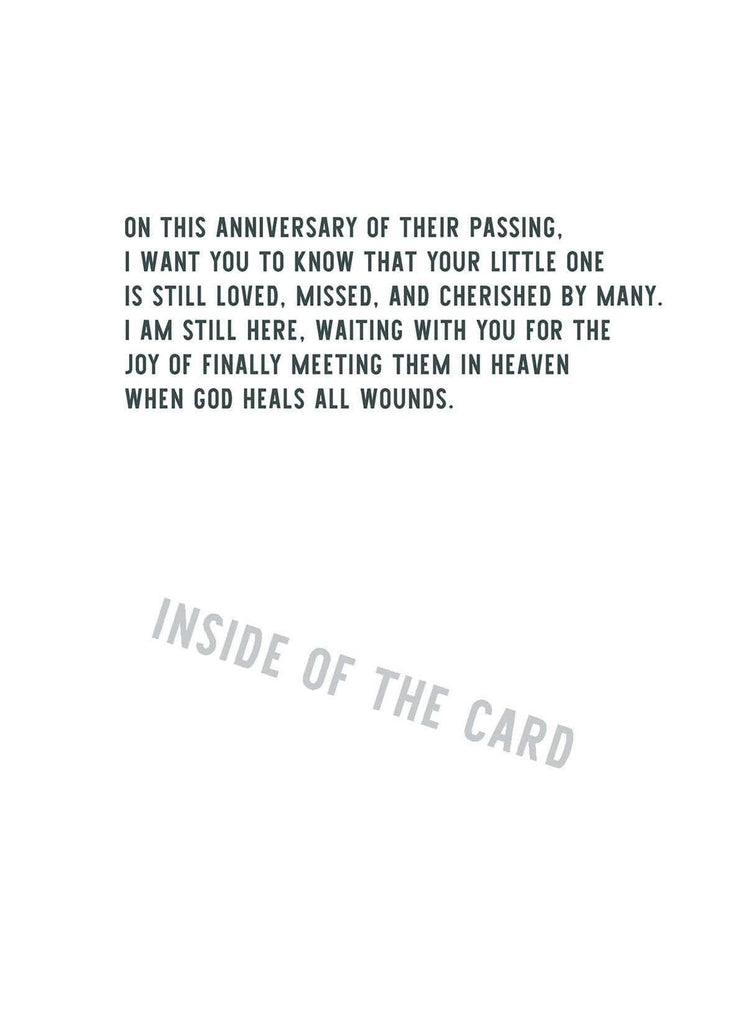Inside says: "On this anniversary of their passing, I want you to know that your little one is still loved, missed, and cherished by many.