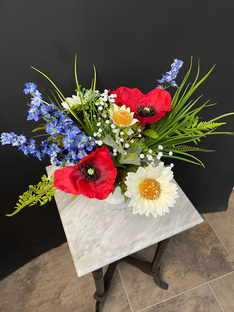 Brighten your space with the vibrant charm of our Patriotic Summer Silk Floral Arrangement. Bold red poppies, crisp white daisies, and vivid blue delphinium stems create a lively, all-American color palette perfect for summer décor. Arranged in a sleek white ceramic vase, this lifelike design brings seasonal cheer to any table, entryway, or mantel—no watering required.