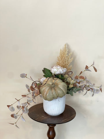 This designer arrangement features a soft-toned pumpkin paired with blush peonies, golden grasses, and muted fall foliage. Styled in a white textured vase, it blends rustic harvest charm with refined elegance. A perfect centerpiece for seasonal decorating, gifting, or adding a cozy autumn touch to your home.
