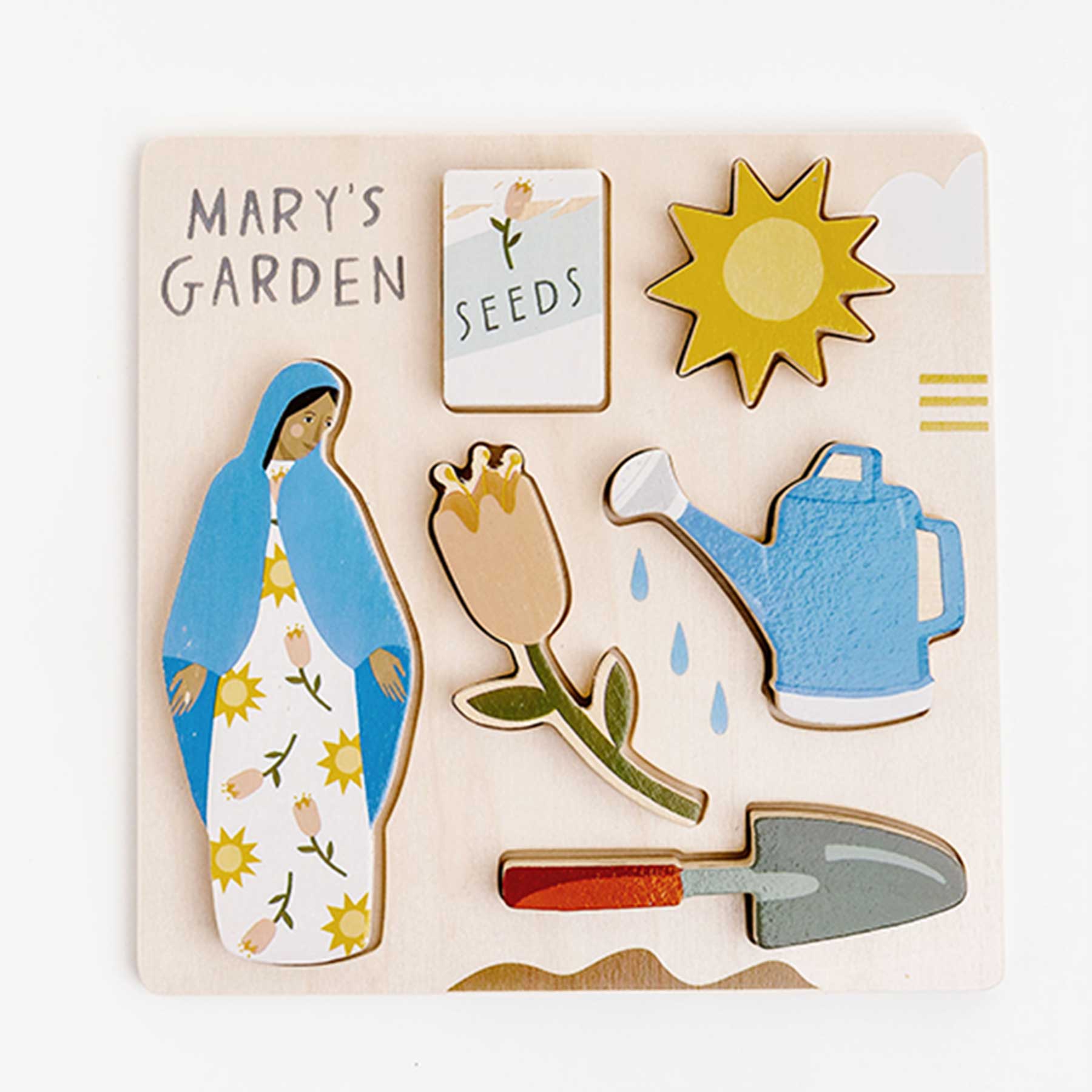 Mary's Garden Wooden Puzzle includes all of the essentials to build a beautiful Marian Garden.