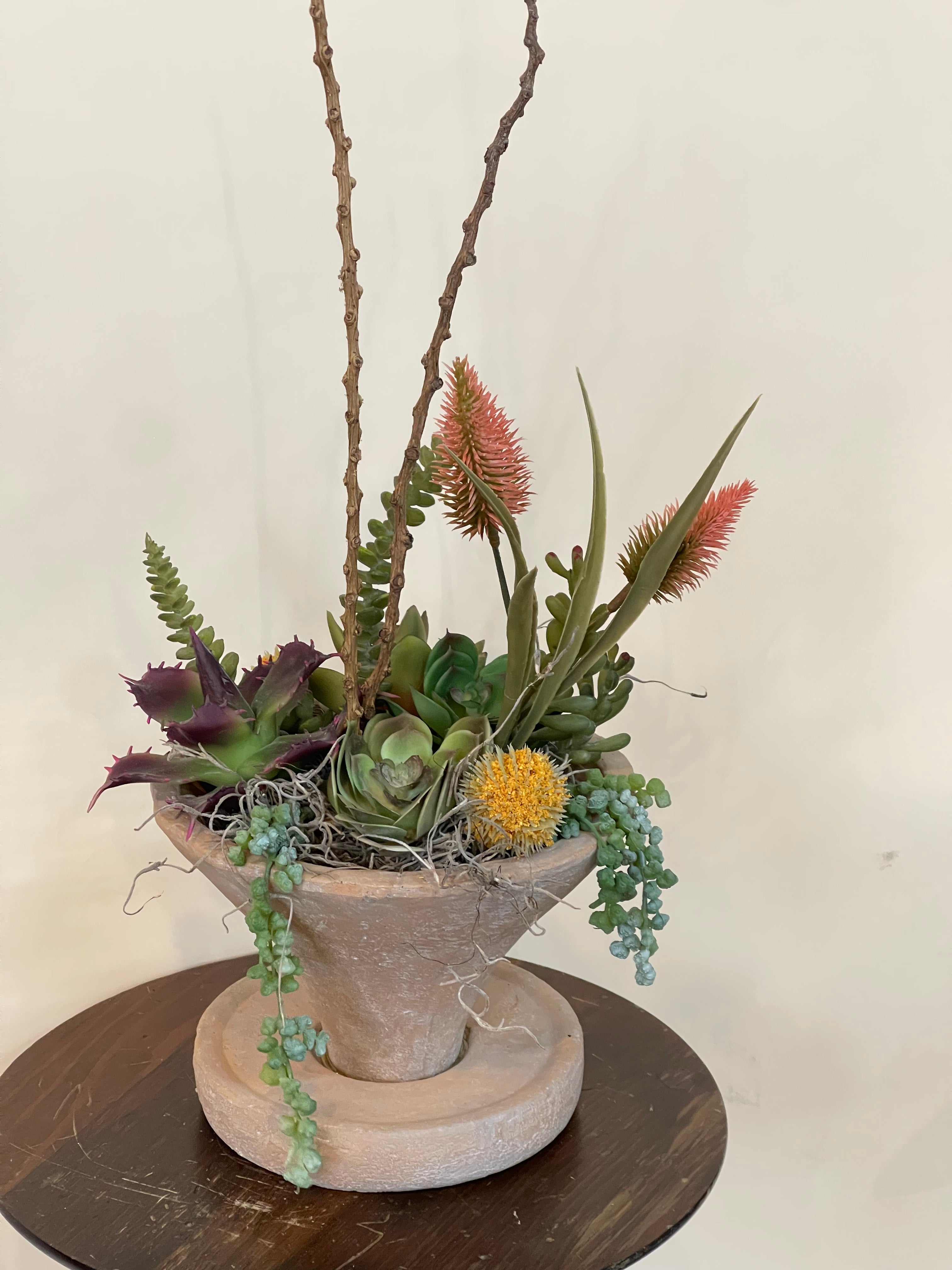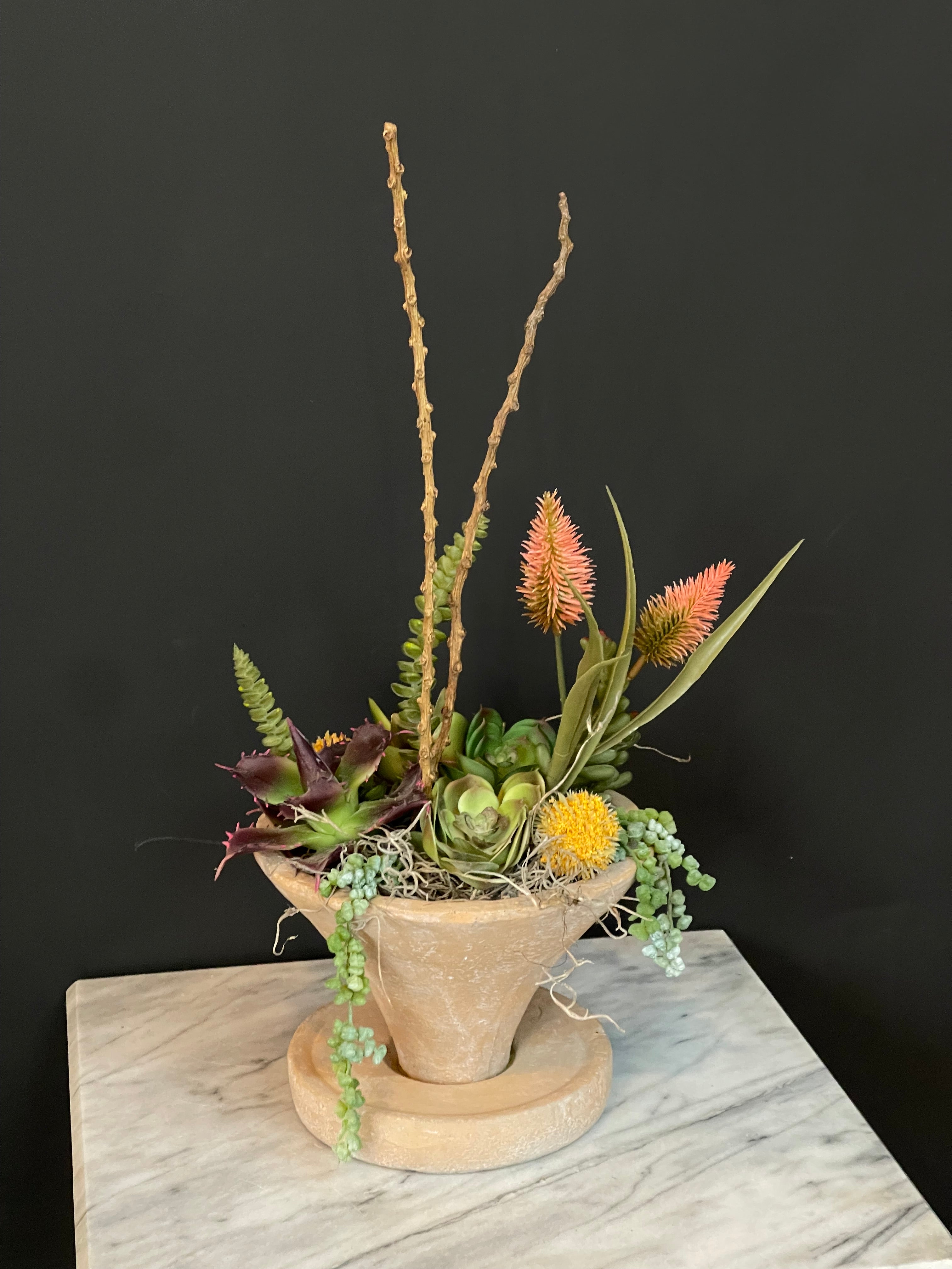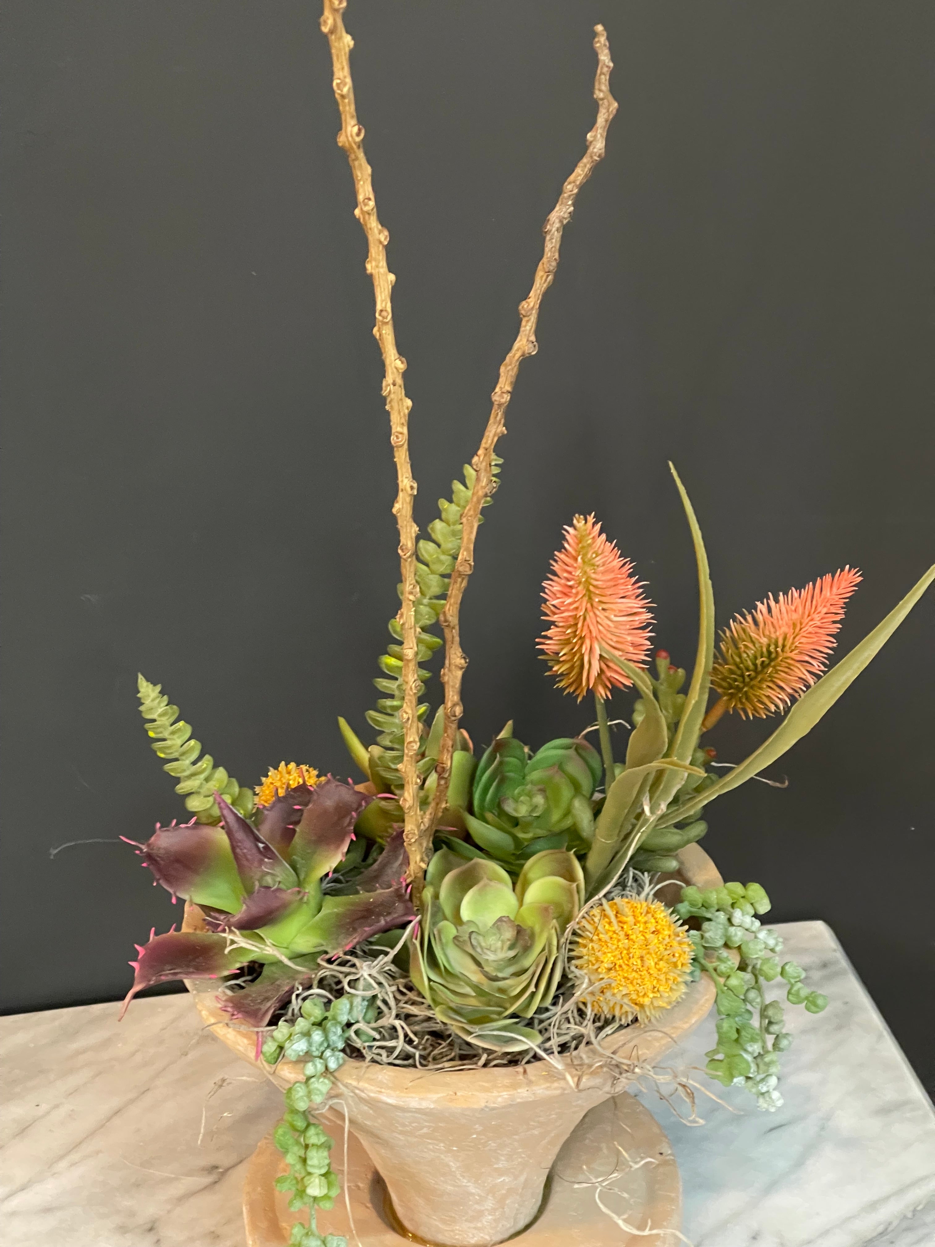 This designer-crafted arrangement features lifelike succulents, trailing greenery, and bold desert-inspired blooms in warm tones. Set in a rustic clay-look pedestal planter, it brings a modern, earthy feel to any space. Maintenance-free and long-lasting, it’s a perfect accent for a home, office, or gift.