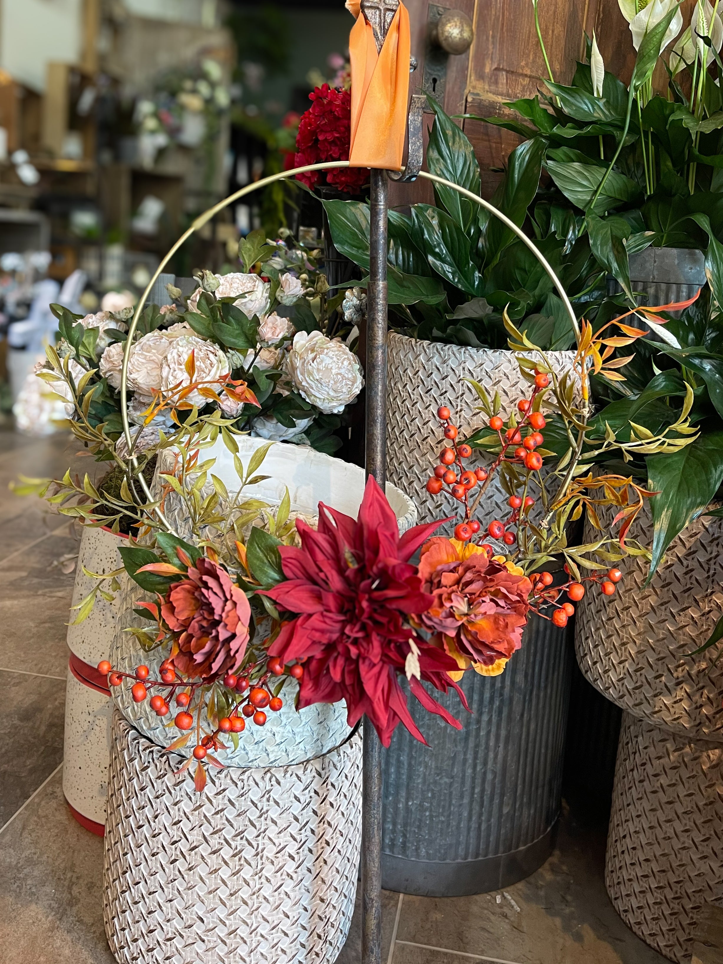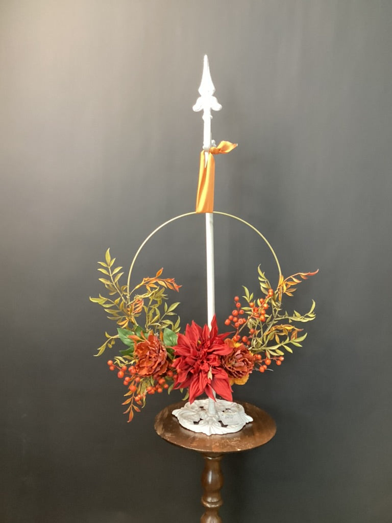 Clean, modern, and full of fall color. A deep red dahlia anchors rust mums, orange berry clusters, and layered greenery on a slim gold hoop for an airy, asymmetrical silhouette. Lightweight and easy to hang, this hoop wreath brings a polished harvest touch to your front door, entry, or mantel—perfect from early fall through Thanksgiving.