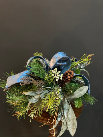 Elegant and timeless, this winter arrangement combines lush evergreens, soft frosted accents, pinecones, and berries, finished with a luxurious blue velvet ribbon. The mix of textures and tones creates a sophisticated seasonal look that works beautifully on mantels, tables, or as a thoughtful holiday gift.