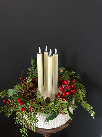 Warm and welcoming, this holiday centerpiece brings timeless beauty to your table. Designed in a white textured container, it features lush evergreen branches, red berries, and natural pinecones surrounding four glowing taper candles. Perfect for dining tables, buffets, or mantels, it’s a festive way to add soft light and traditional Christmas charm to any space.