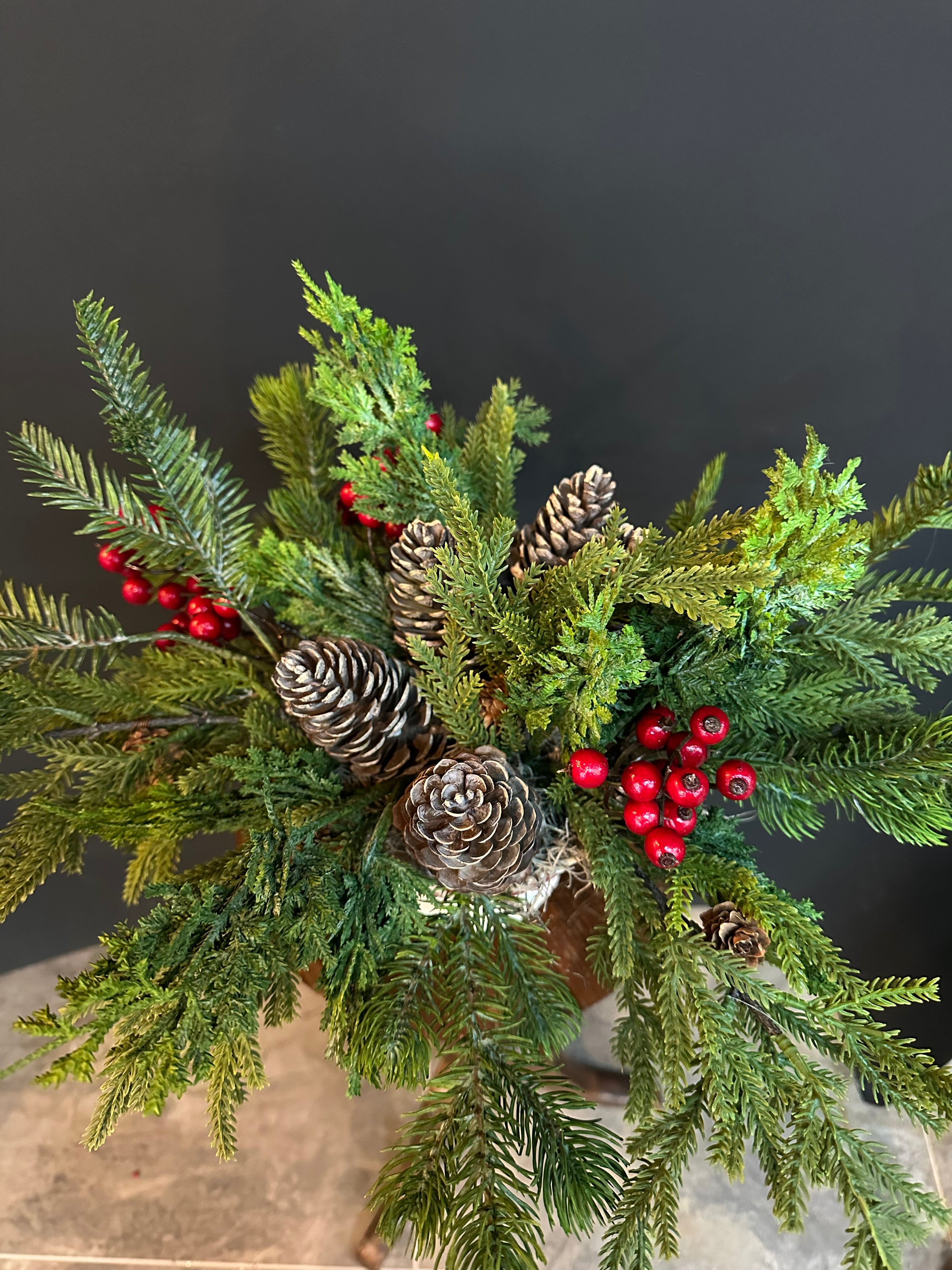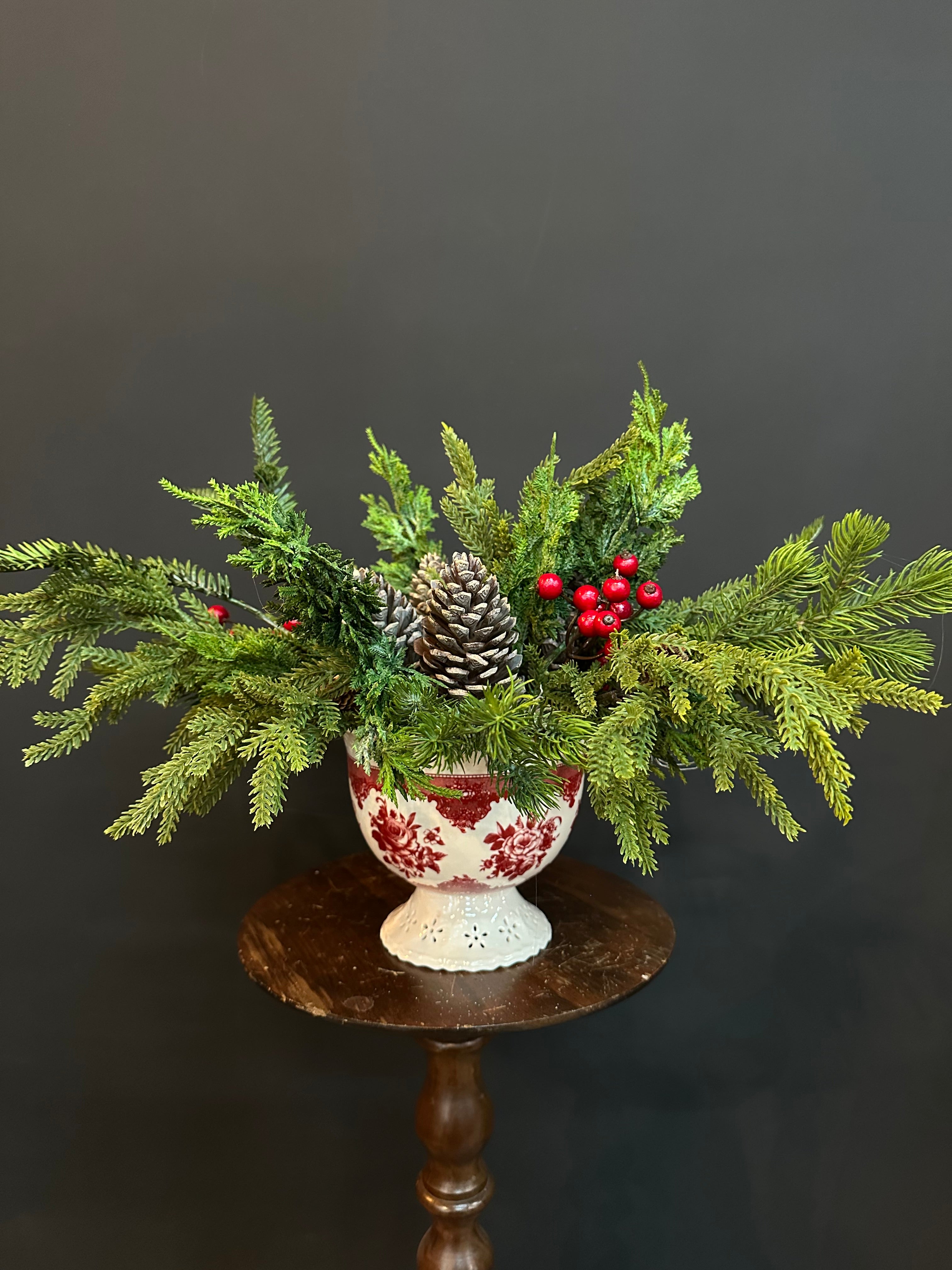Bring the spirit of the season to life with this timeless holiday arrangement. Set in an elegant red-and-white pedestal container, it features lush evergreen branches, natural pinecones, and vibrant red berries for a traditional Christmas look. Perfect for centerpieces, mantels, or entry tables, this piece adds a warm and festive touch to any space.