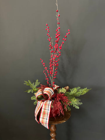 Add a burst of holiday cheer to your home with this vibrant berry arrangement. Designed in a red container, it features tall red berry stems, lush evergreens, pinecones, and a classic plaid bow for a warm, traditional look. Perfect for mantels, dining tables, or entryways, this piece brings timeless Christmas charm to any space.
