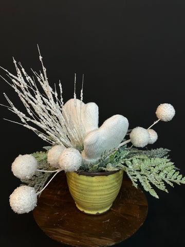 Add a playful touch of winter magic to your space with this frosted white arrangement. Designed in a cheerful yellow pot, it features sparkling white elements, textured greenery, and soft decorative shapes for a modern, wintry look. Perfect for shelves, desks, or side tables, this piece brings a fresh and unexpected pop of seasonal décor.