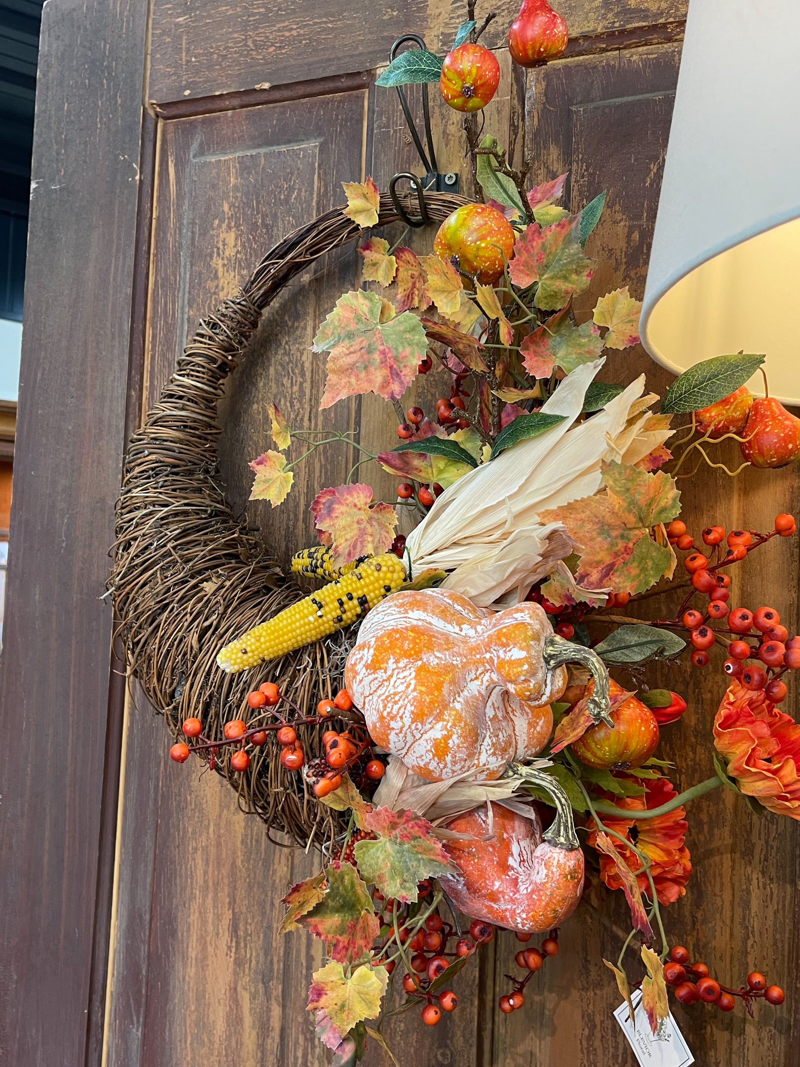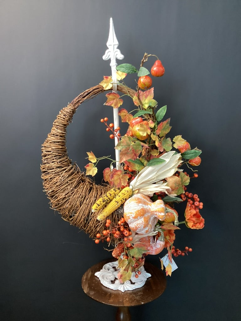 A sculptural take on the classic cornucopia. A crescent of natural grapevine overflows with lifelike pumpkins and gourds, decorative Indian corn, golden husks, pears, and clusters of orange bittersweet, all tucked among mottled maple leaves and trailing vines. The asymmetrical shape makes a striking harvest statement for your front door, entry, or mantel—festive from early fall through Thanksgiving.