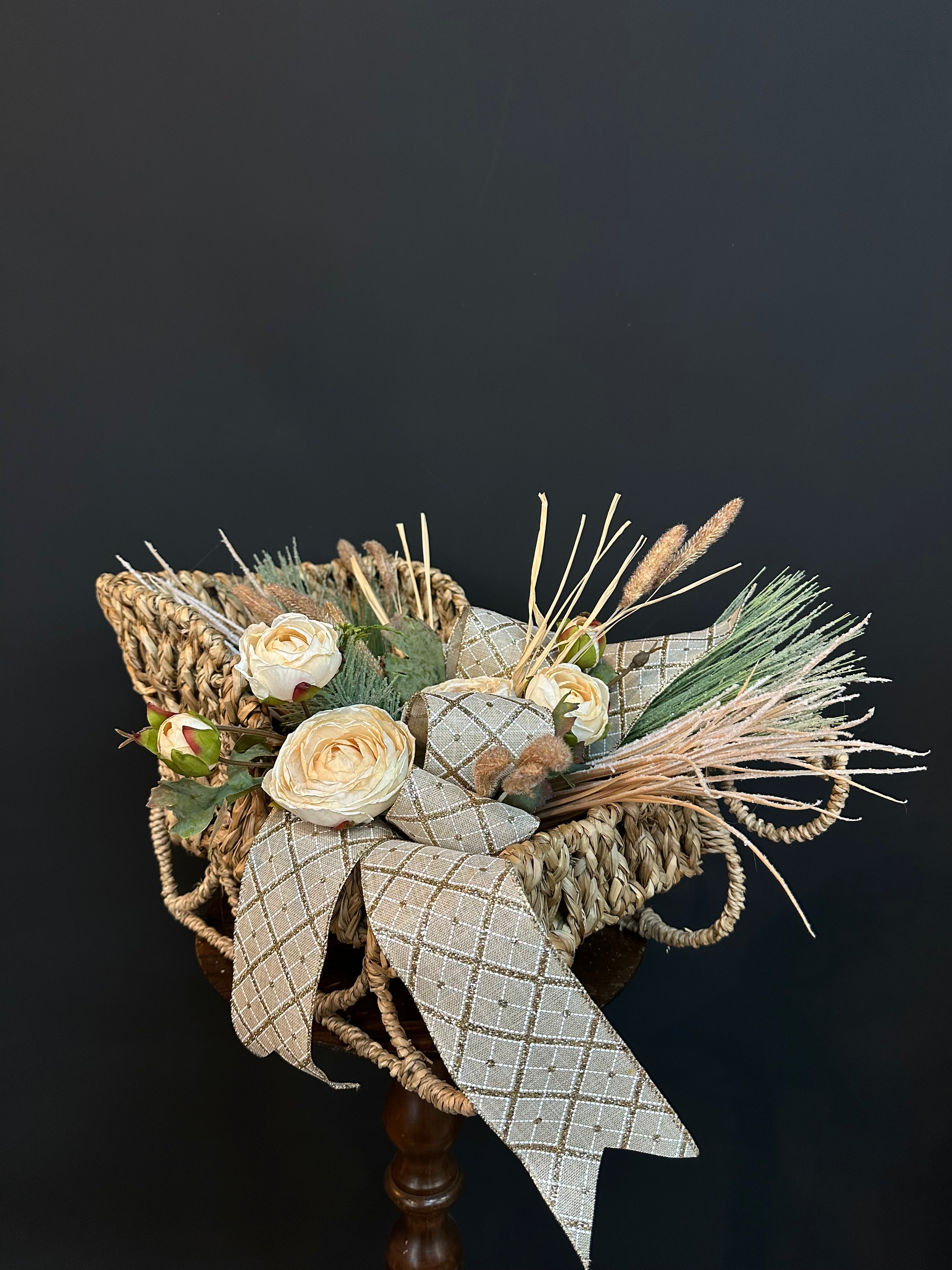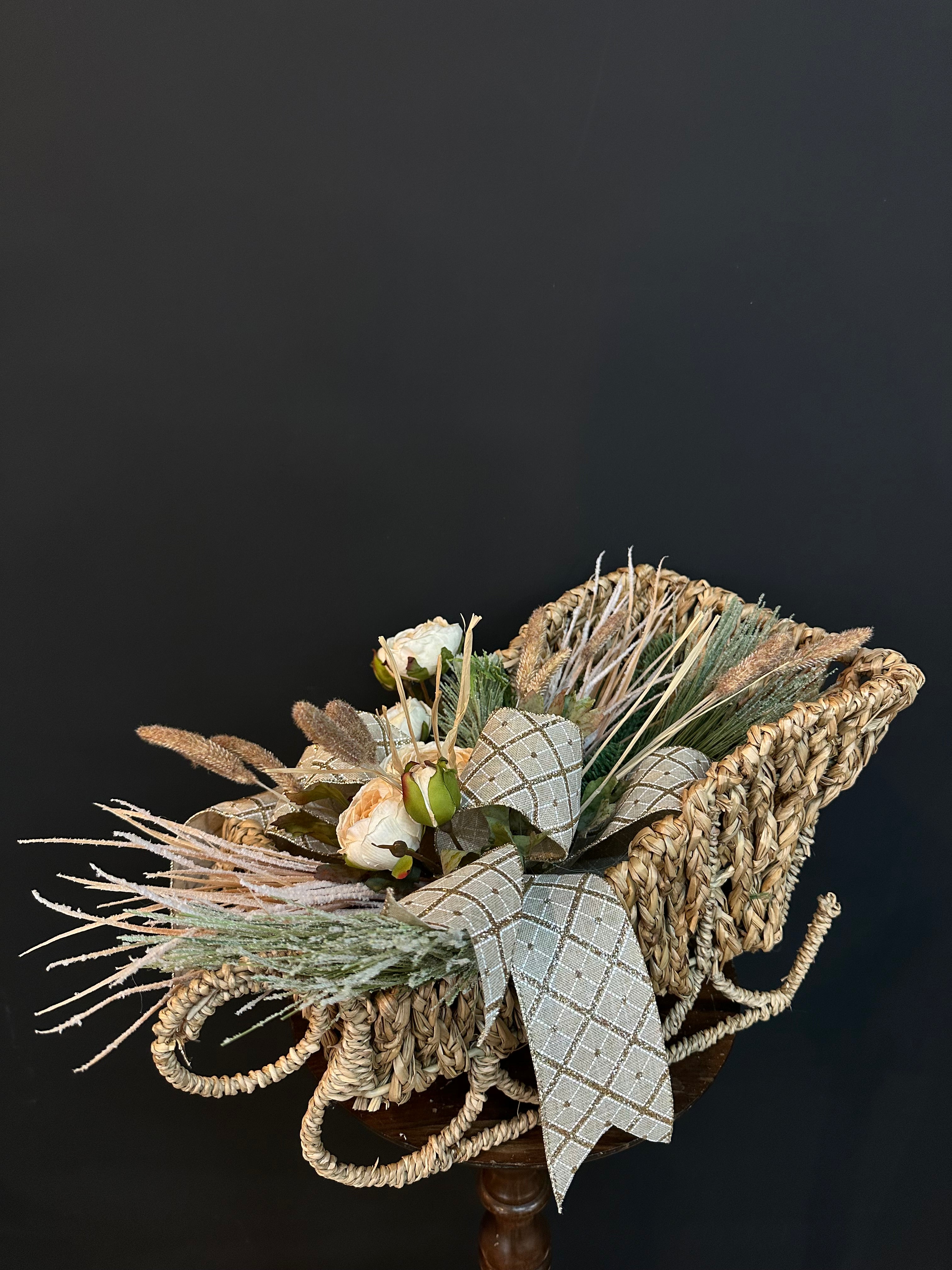 This charming neutral winter arrangement is designed in a woven sleigh basket, blending soft seasonal textures with a touch of rustic elegance. Cream blooms, frosted greenery, natural grasses, and a beautifully patterned ribbon create a cozy, timeless look that works seamlessly in any space. Perfect for tables, shelves, or entryways, this piece brings understated winter charm to your home all season long.