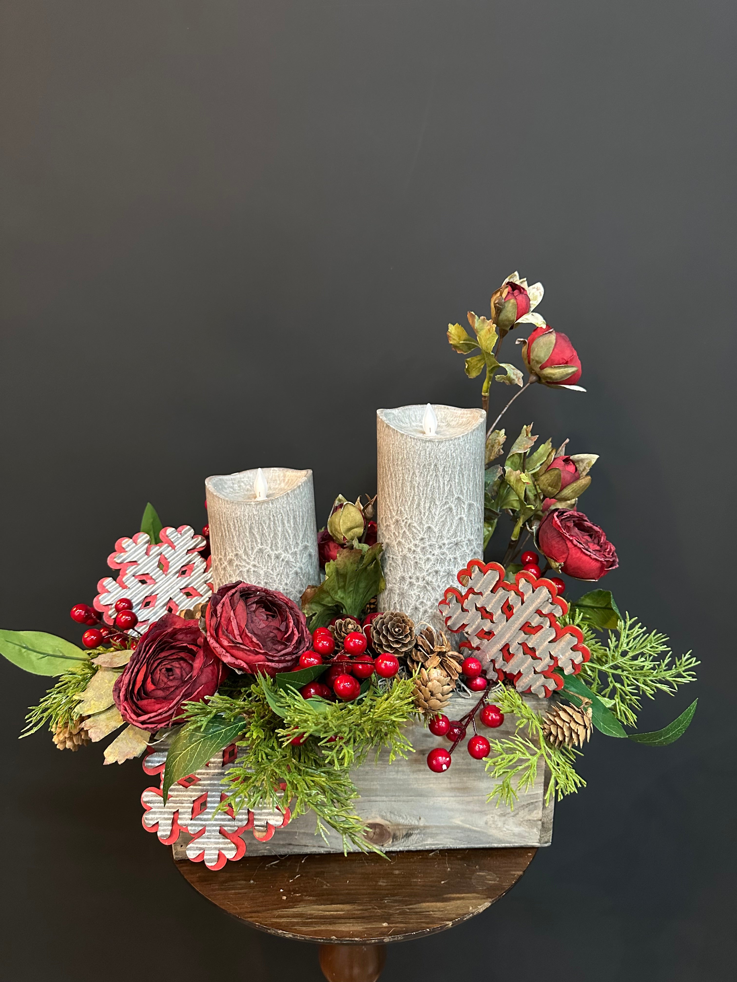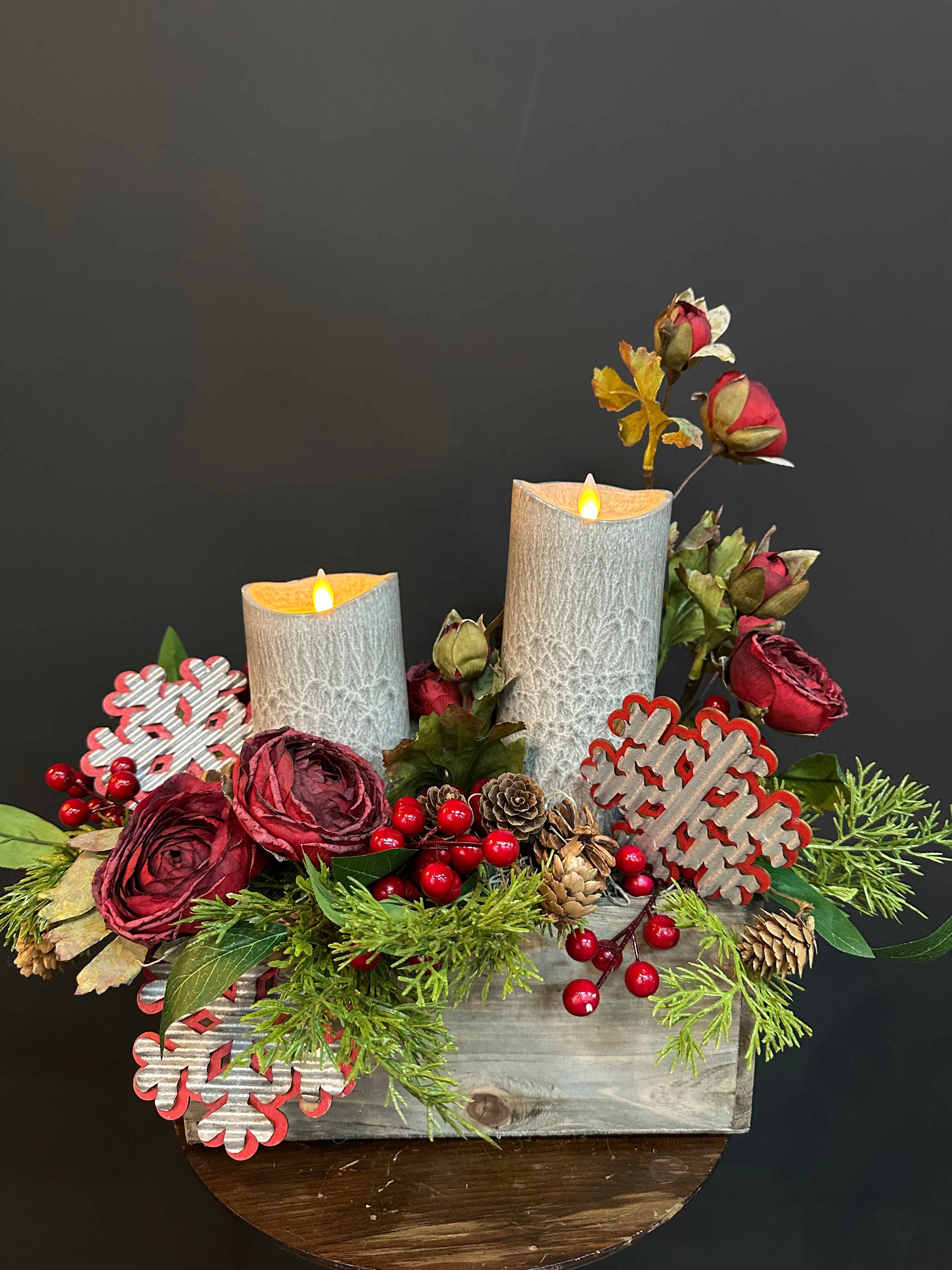 Infuse your home with cozy holiday charm using this rustic candle arrangement. Set in a wooden box, this centerpiece features lifelike evergreens, rich red blooms, vibrant berries, and natural pinecones, accented with playful red-and-white wooden snowflakes. Two flameless pillar candles cast a soft, warm glow—perfect for creating a festive atmosphere all season long.