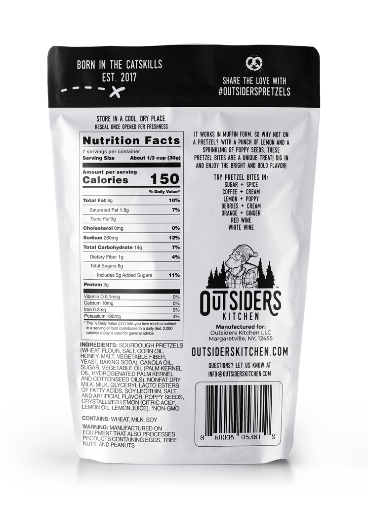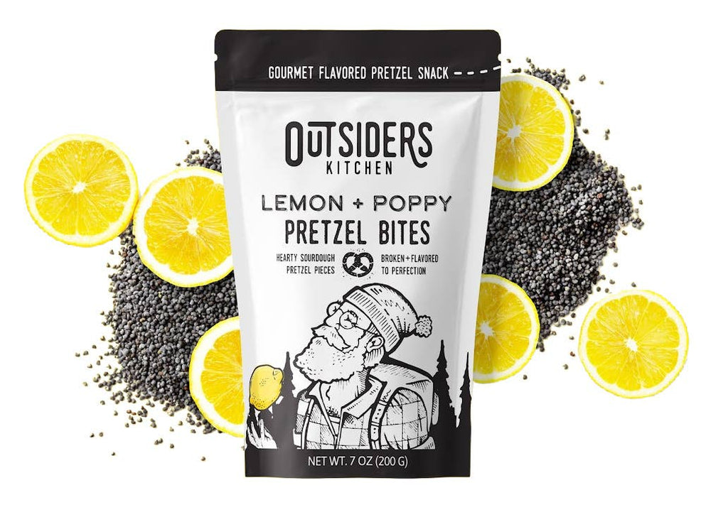 Bright, bold, and totally unexpected, Outsiders Kitchen Lemon + Poppy Pretzel Bites are a fresh twist on snacking. Zesty lemon meets earthy poppy seeds on a crunchy pretzel bites for a flavor that’s both surprising and seriously satisfying. Made in small batches, these bites are a go-to for flavor explorers who crave something different. Perfect for pairing with tea, cheese, or eating straight from the bag, they’re as versatile as they are addictive. Whether you’re hosting, road-tripping, or just hungry for something original, Lemon + Poppy Pretzel Bites bring the zing. Ordinary snacks don’t stand a chance!
