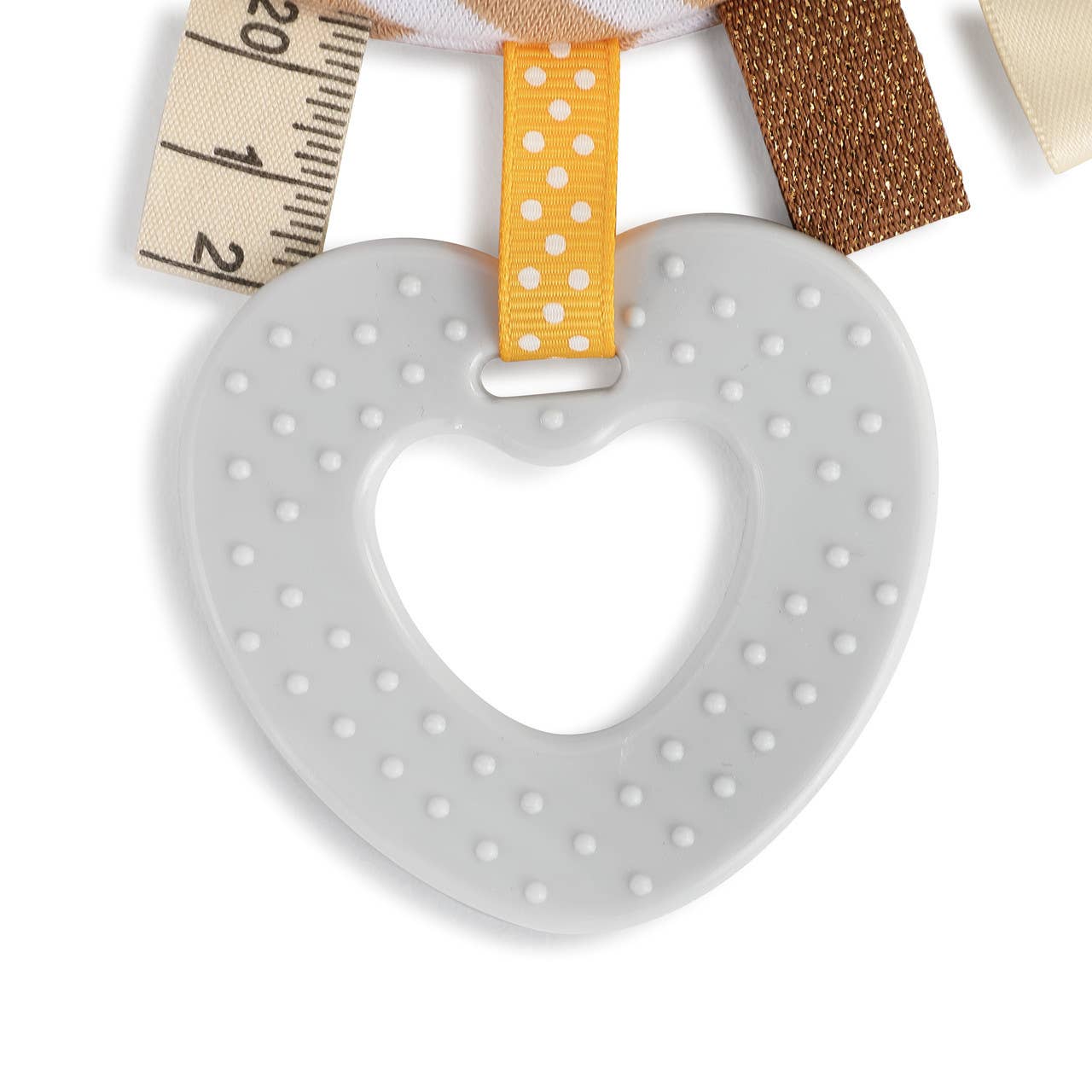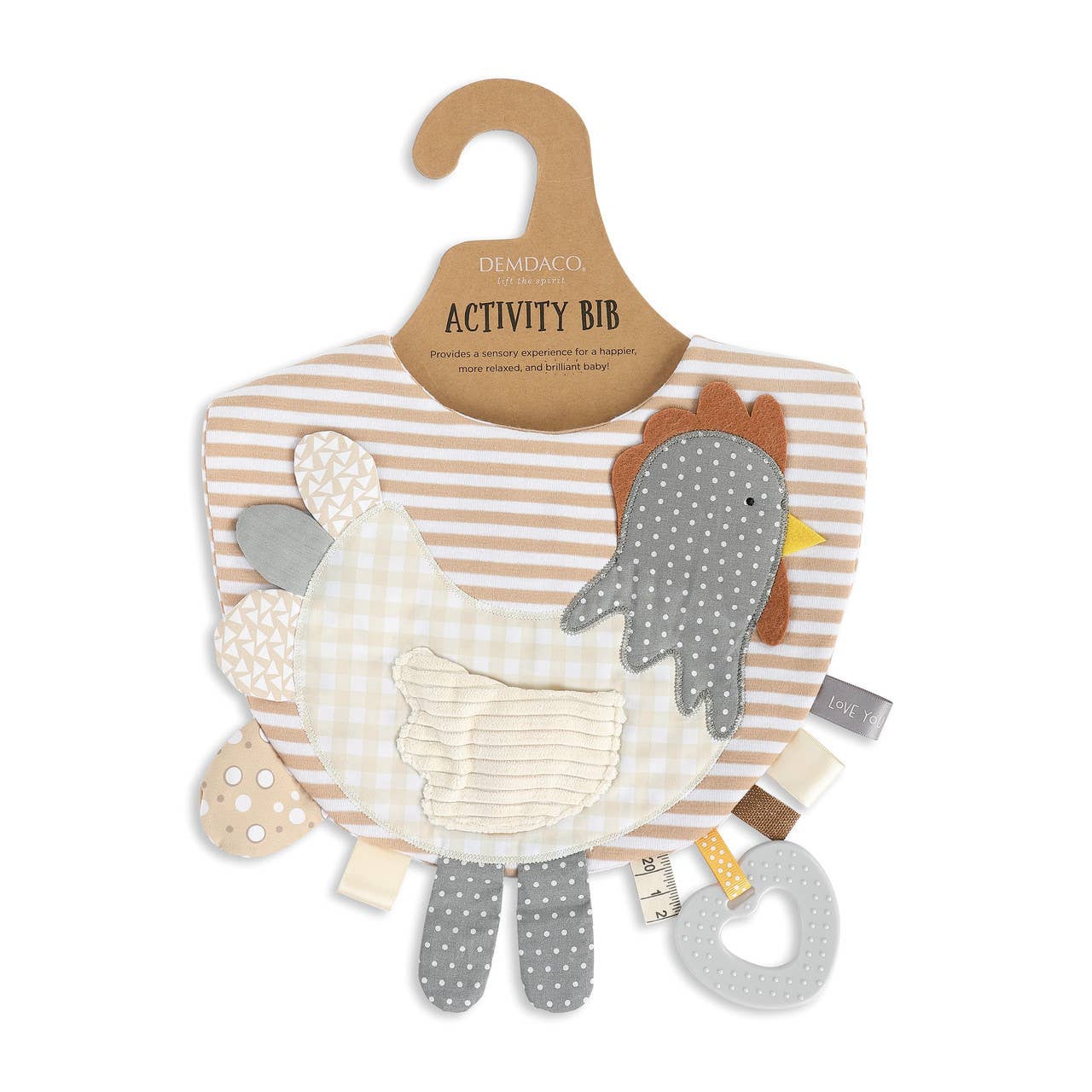 The Mommy & Me Activity Collection gives extra opportunities for any mommy and baby time to be both comforting and fun. Artist Jennifer Heynen was inspired by experiences with her own children to create wearable items with toys and cozy items for baby. Mommy and Me Activity Bibs bring mother and child together with fun and stimulating textures and early education extras in a pleasing aesthetic design. Serving as a cute rooster themed bib and activity playset all in one, bib includes a 3D cloth tail with a textured body and pocket, a small yellow chick to go in the pocket, 5 cloth tabs of varying sizes to interest baby, 2 tactile crinkle paper tabs, 1 squeak toy, and a teething ring, with a soft Velcro closure on the back. DEMDACO Mommy & Me Activity Bib - Rooster. Bib measures10" by 11.5" and is made of cotton and polyester. Machine wash, hang dry. Teething ring is BPA-free and Phthalate-free.