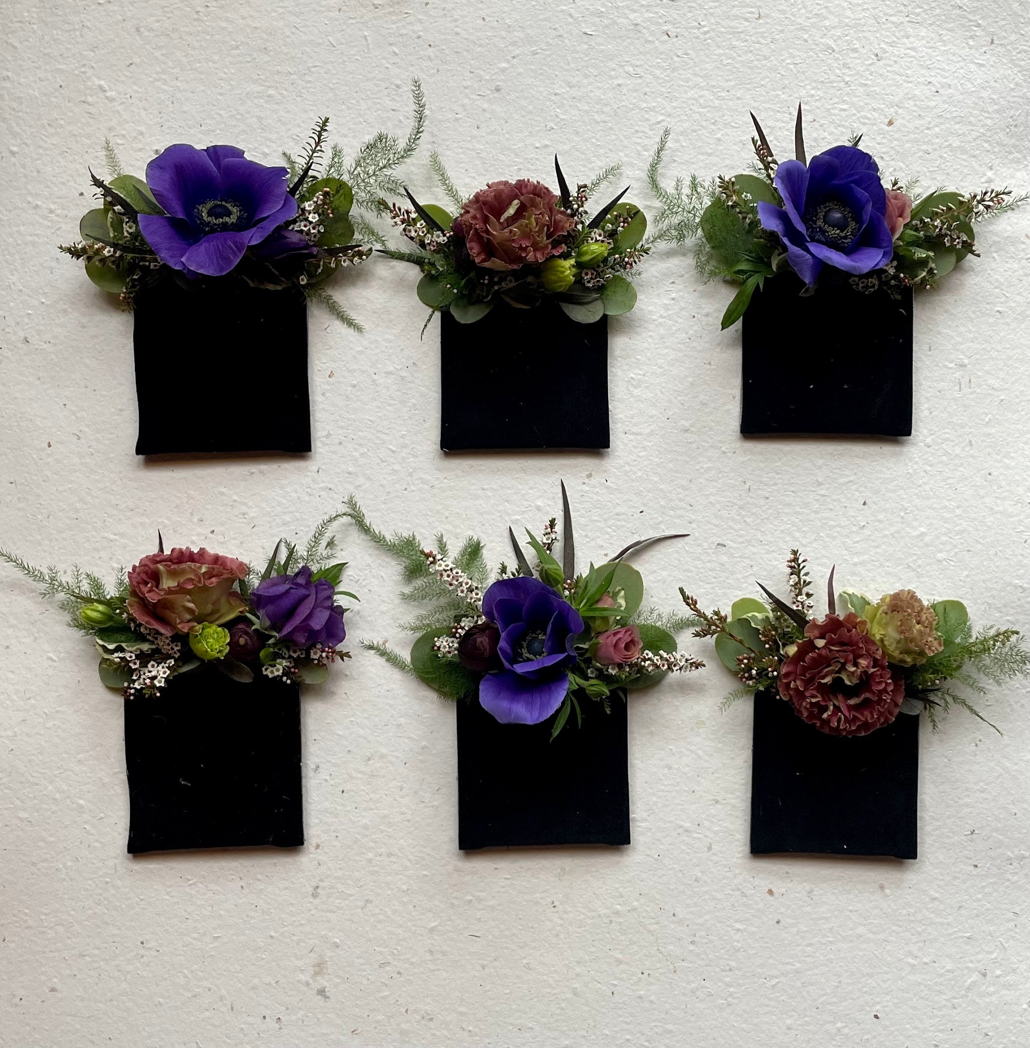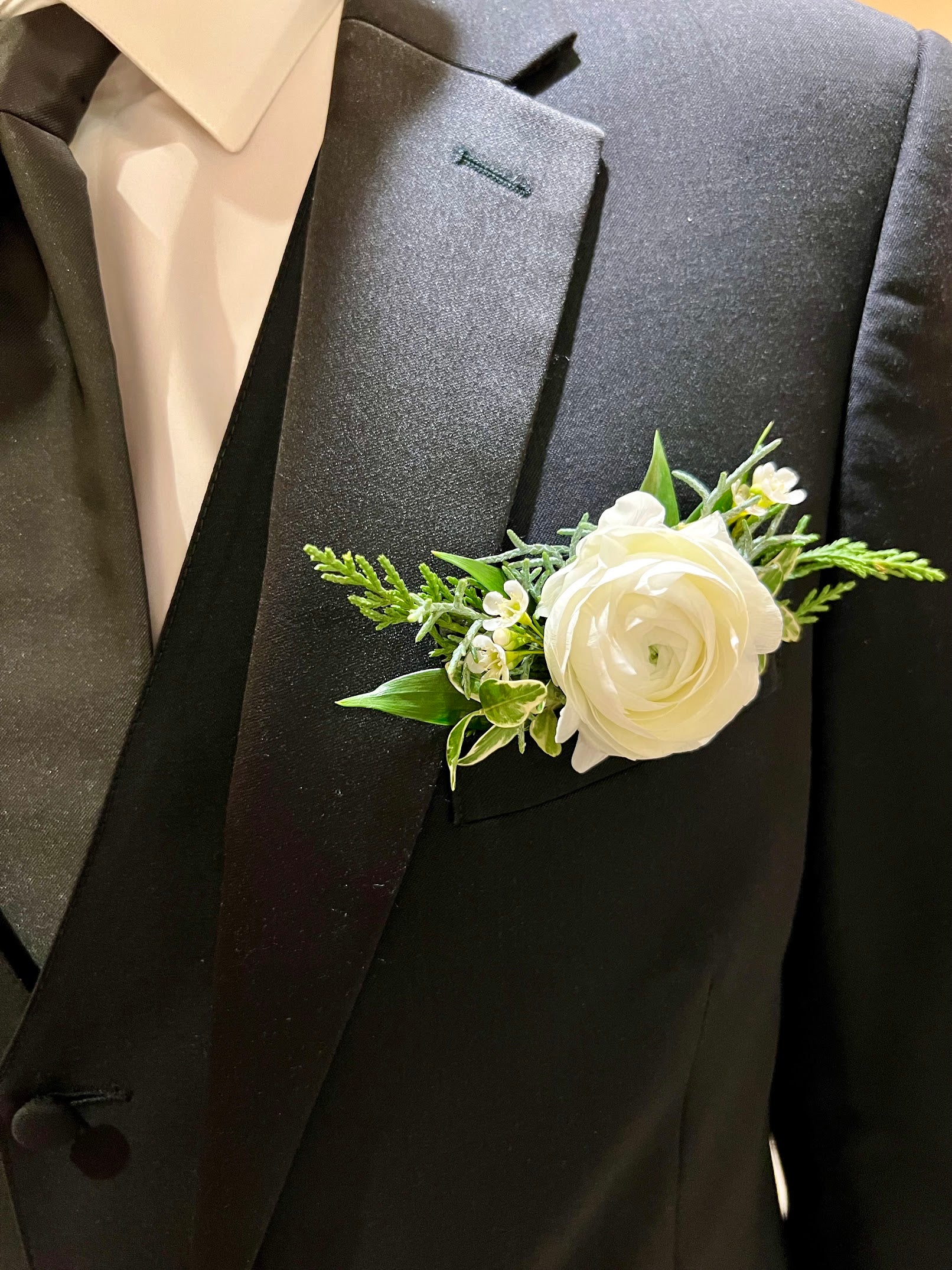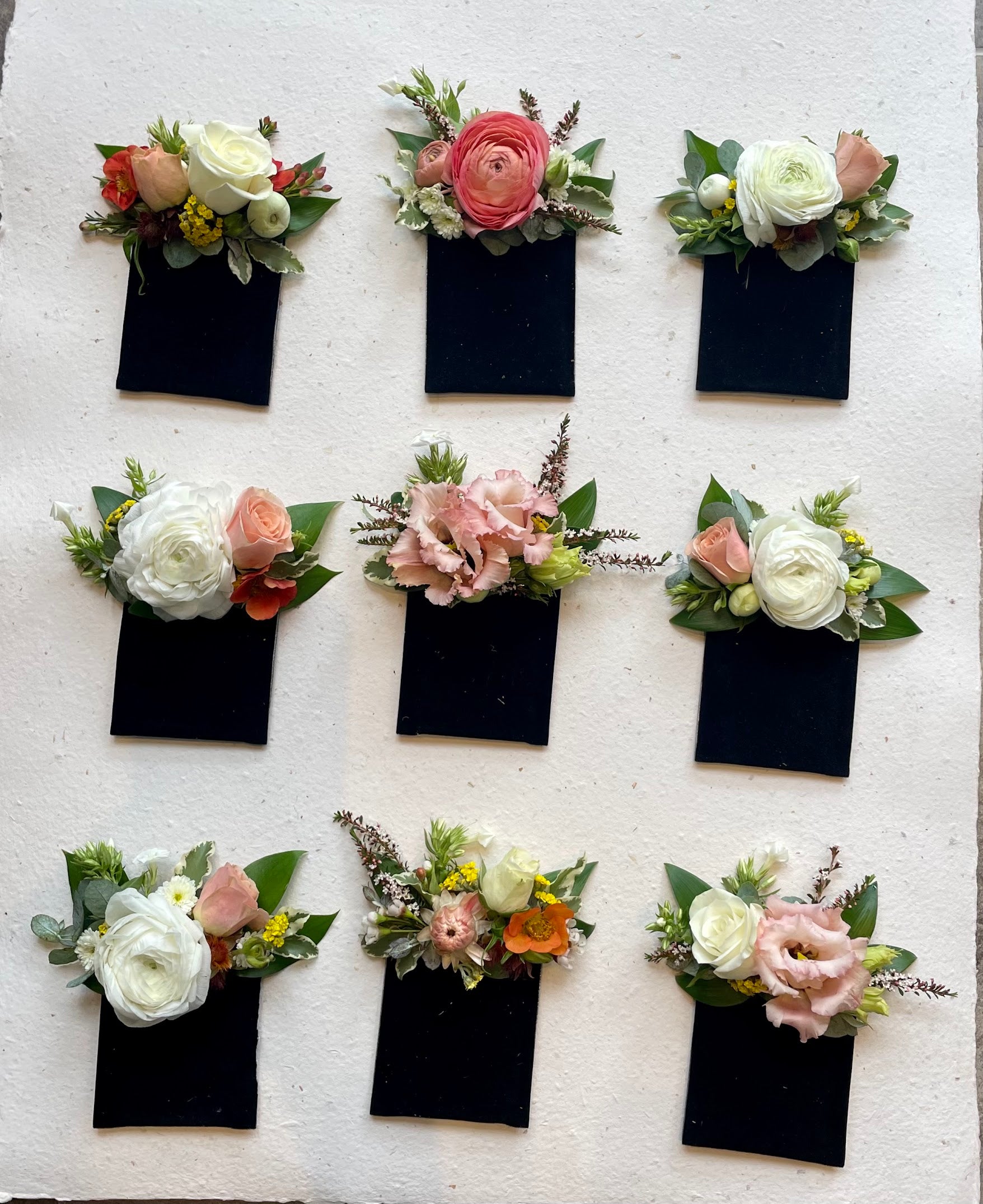 The online a-la-carte bridal boutonnieres available will contain the same ingredients as the bridal bouquet. Choose between Pocket Square or Pin-on.