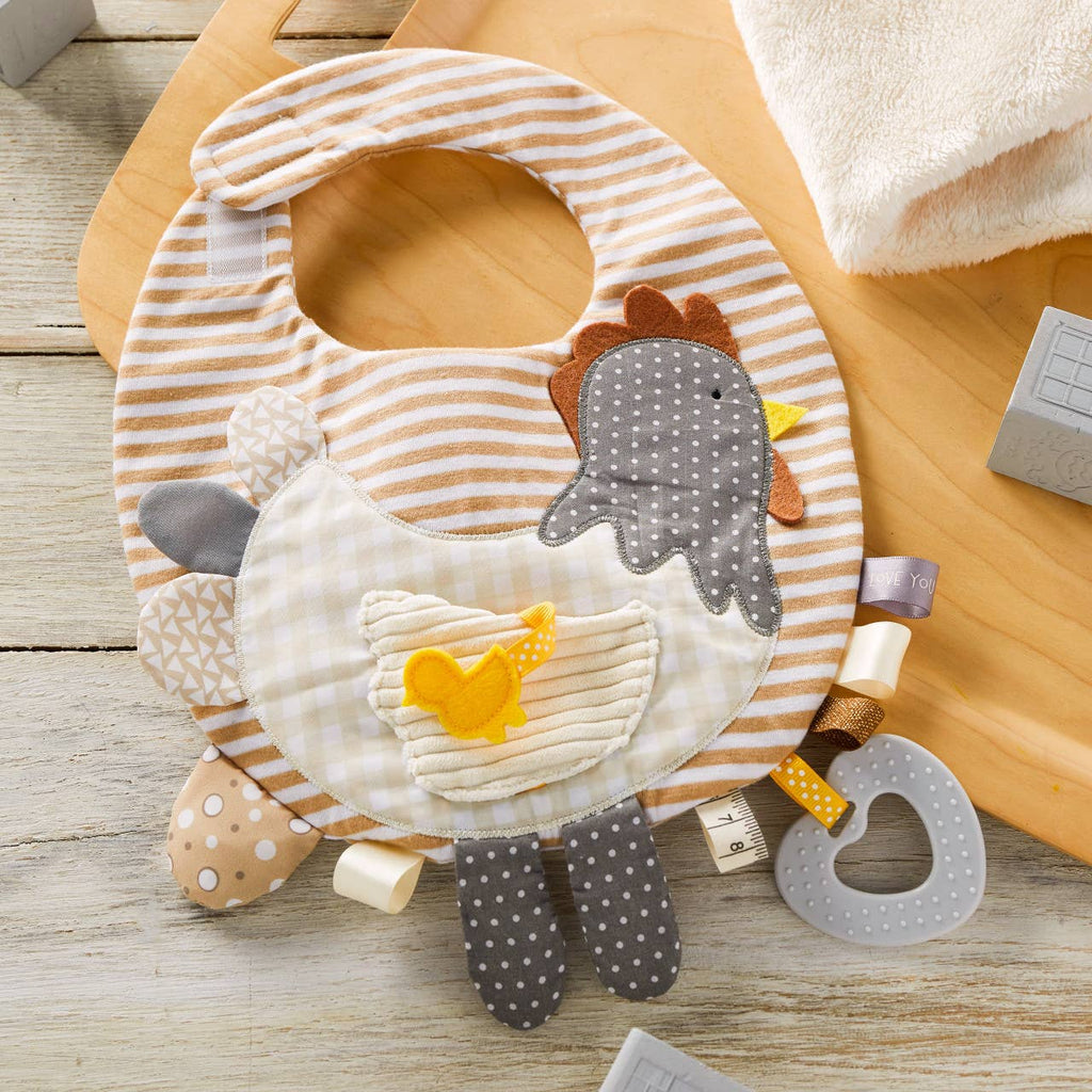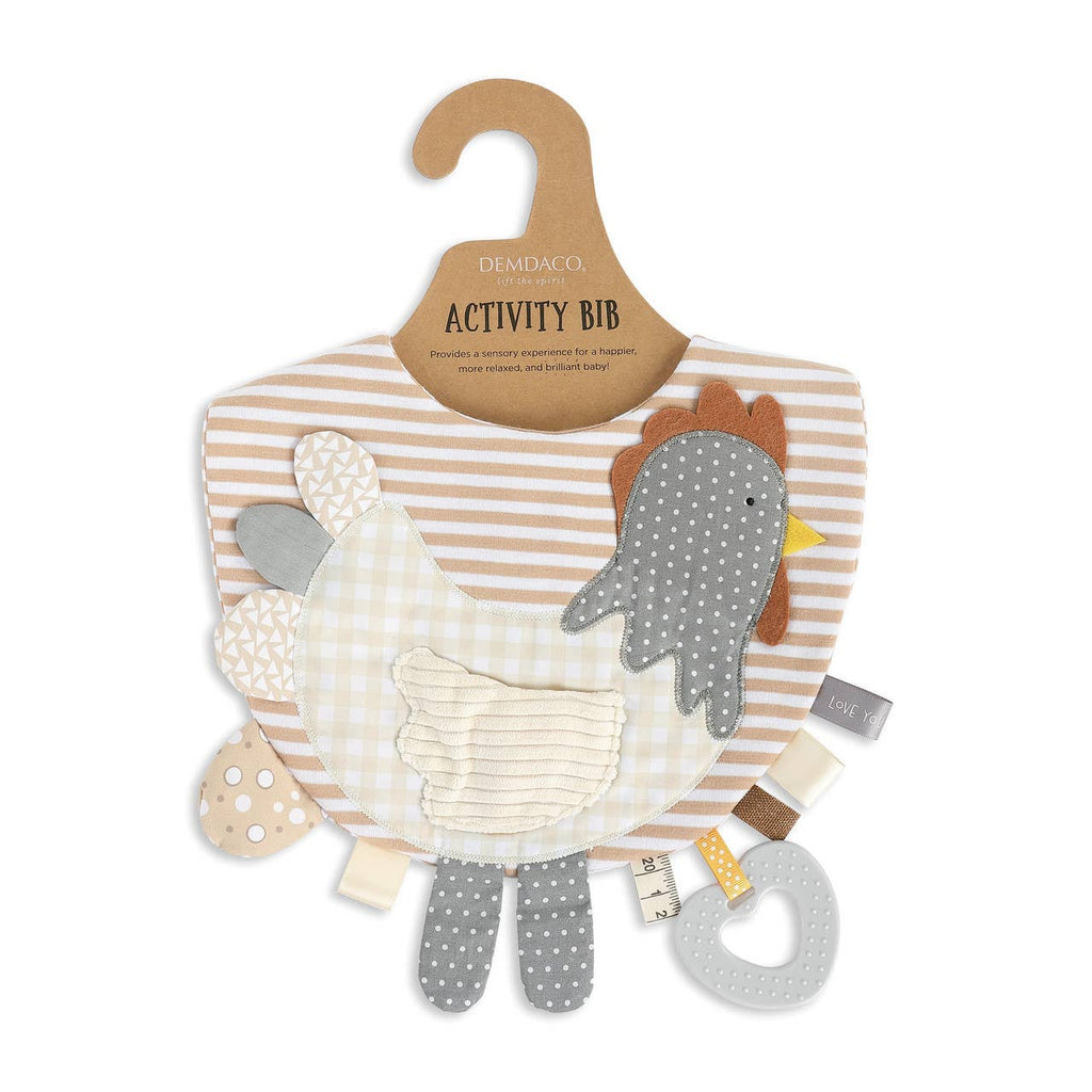The Mommy & Me Activity Collection gives extra opportunities for any mommy and baby time to be both comforting and fun. Artist Jennifer Heynen was inspired by experiences with her own children to create wearable items with toys and cozy items for baby. Mommy and Me Activity Bibs bring mother and child together with fun and stimulating textures and early education extras in a pleasing aesthetic design. Serving as a cute rooster themed bib and activity playset all in one, bib includes a 3D cloth tail with a textured body and pocket, a small yellow chick to go in the pocket, 5 cloth tabs of varying sizes to interest baby, 2 tactile crinkle paper tabs, 1 squeak toy, and a teething ring, with a soft Velcro closure on the back. DEMDACO Mommy & Me Activity Bib - Rooster. Bib measures10" by 11.5" and is made of cotton and polyester. Machine wash, hang dry. Teething ring is BPA-free and Phthalate-free.