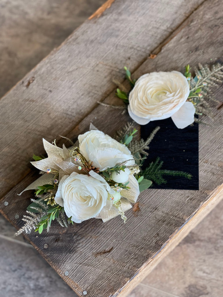 The online a-la-carte bridal boutonnieres available will contain the same ingredients as the bridal bouquet. Choose between Pocket Square or Pin-on.