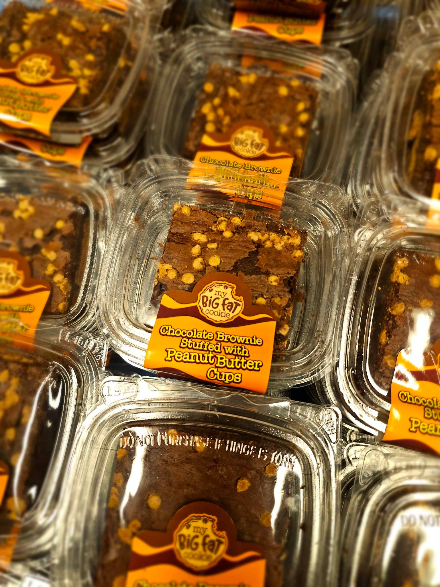This is our newest chewy fudgy brownie! Stuffed with Reese's Peanut Butter Cups and topped with mini Reese's Peanut Butter Chips! It's like eating a Reese's Peanut Butter Cup cake! So good!