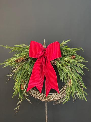 Bring timeless holiday charm to your home with this handcrafted wreath. Featuring realistic real-touch greenery, natural pinecones, and a bold red velvet bow, it’s designed to make a festive statement on any door, wall, or gate. Suitable for both indoor and outdoor décor, this wreath blends rustic texture with classic Christmas elegance.